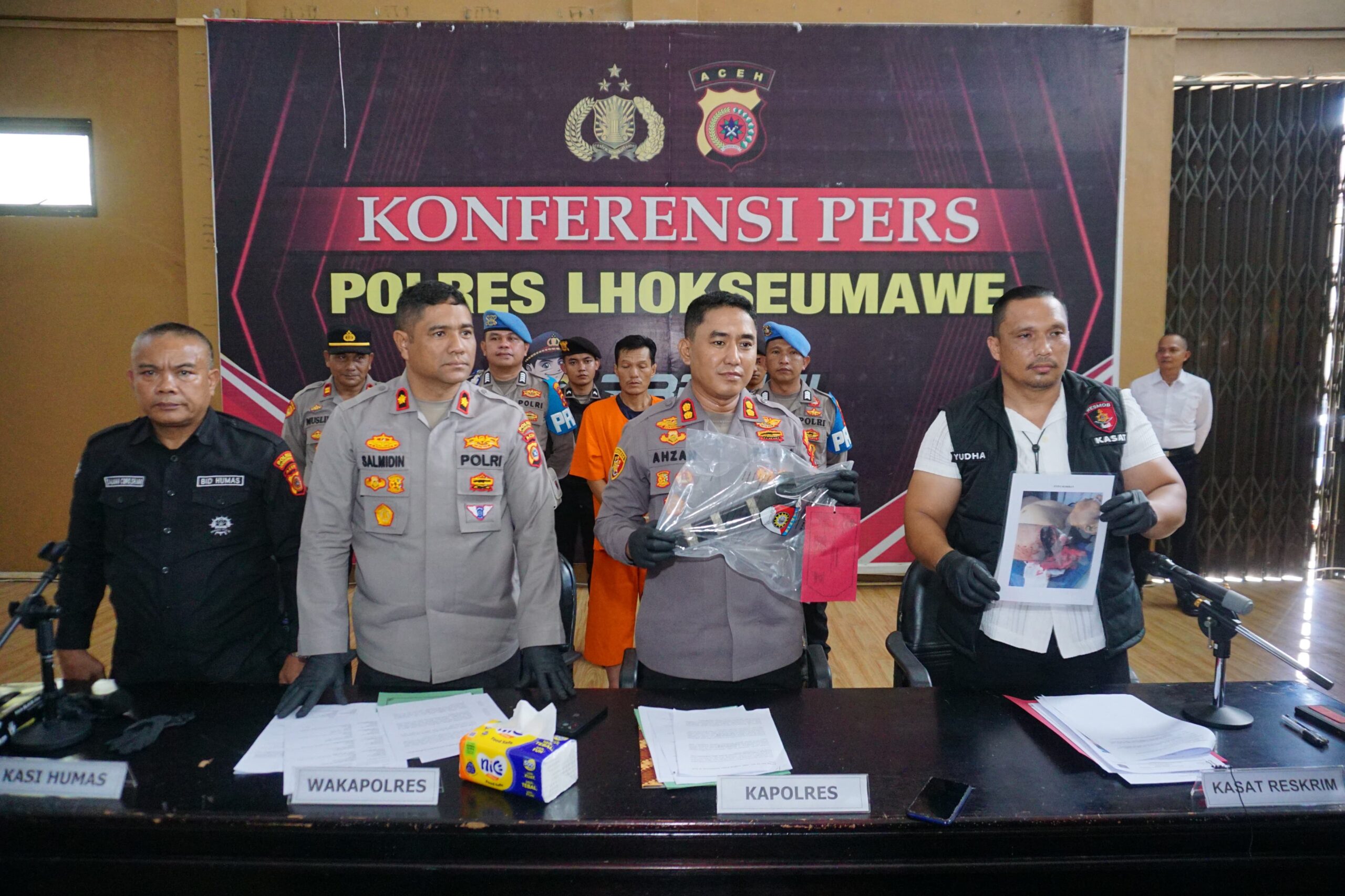 Namun, suasana menjadi panas saat pelaku menyampaikan keluhannya. “Coba Abang Alek tengok, gara-gara hilang handphone saya harus bercerai dengan istri saya,” ucap tersangka BB. Korban yang merasa tersulut lalu menjawab, “Jadi kamu apa, mau pukul, berani kamu?”., ujar Kapolres Lhokseumawe didamping Wakapolres Lhokseumawe, Kasat Reskrim dan Kasi Humas.