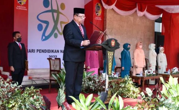 TROL, Tulungagung- Pemerintah kabupaten Tulungagung menggelar upacara pengibaran bendera merah putih dalam rangka memperingati Hari Pendidikan Nasional tahun 2022 dengan tema Pimpin Pemulihan , Bergerak Untuk Wujudkan Merdeka Belajar. Upacara ini bertempat di halaman kantor Pemkab Tulungagung pada Jum’at pagi (13/5).