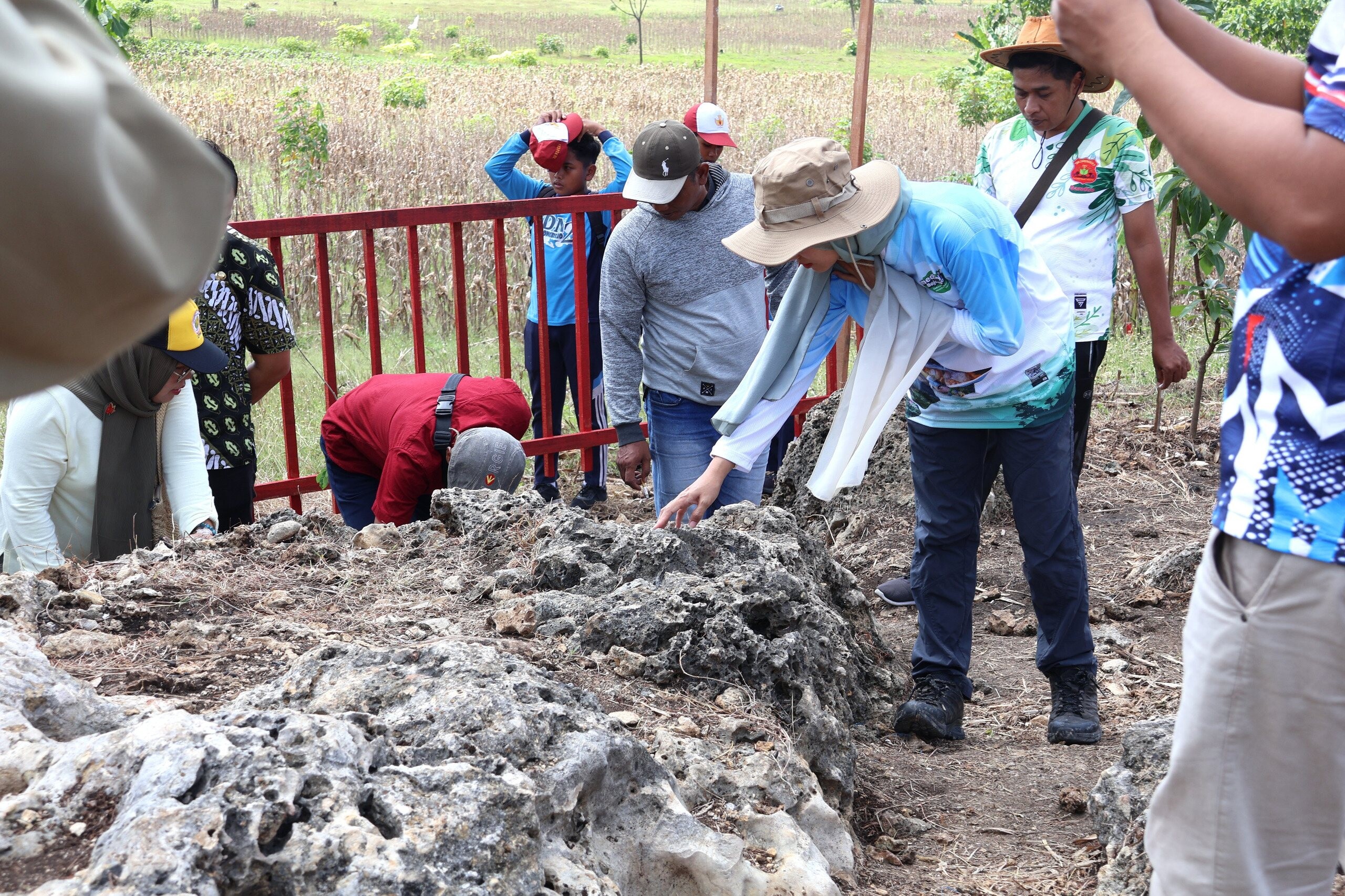 Tim VGN kemudian mengunjungi Geosite Gigi Hiu Desa Jono, Kecamatan Temayang. “Selain motif batik tumbuh-tumbuhan dan ikon yang ada di Bojonegoro, juga bisa ditambahkan jenis motif batik baru seperti fosil-fosil yang sudah ditemukan di sini, seperti gigi hiu dan ditambahkan HAKI-nya,” saran Meliawati serius.