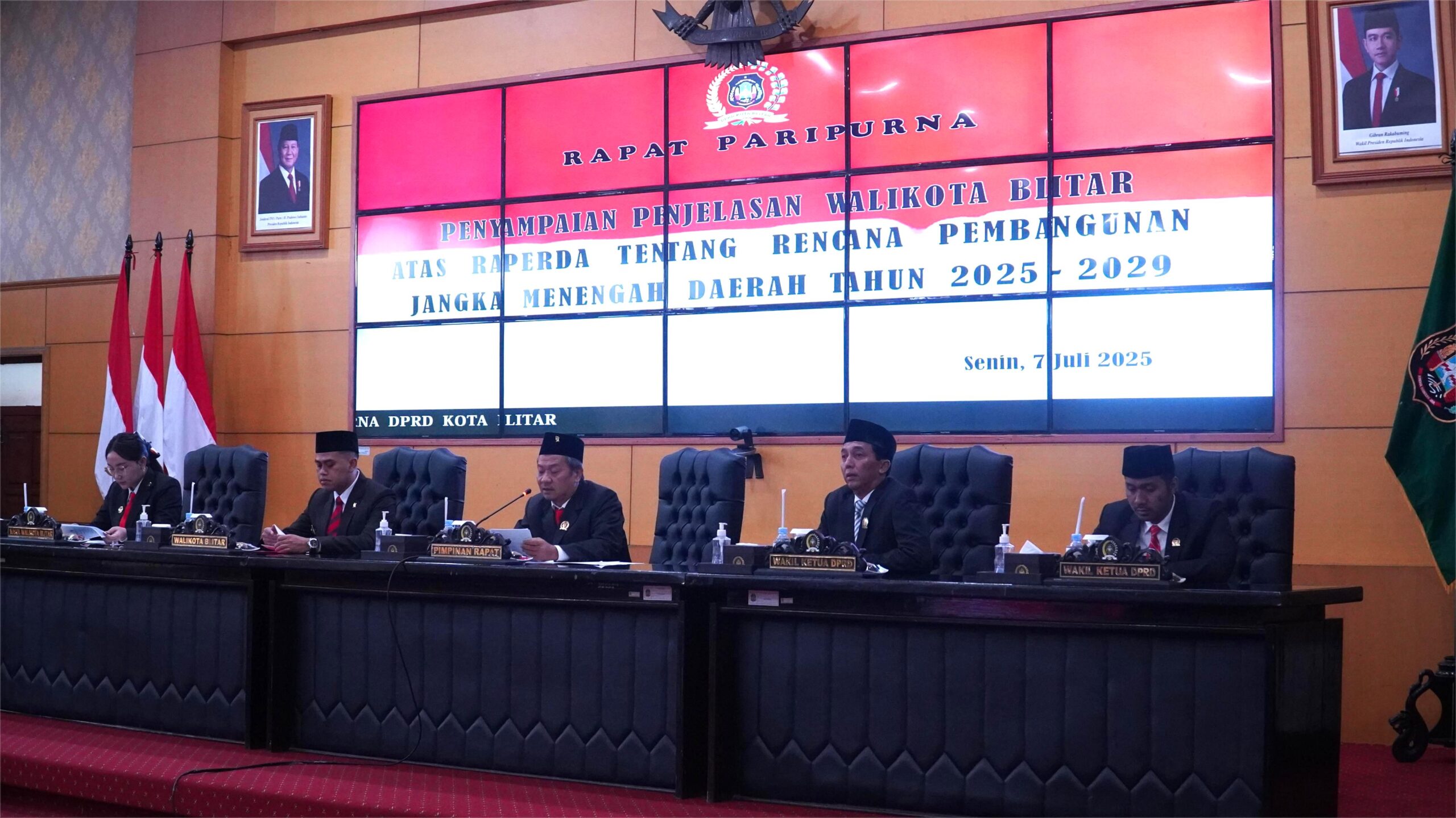 TROL, Kota Blitar – DPRD Kota Blitar menggelar rapat paripurna dengan agenda penyampaian penjelasan Wali Kota Blitar atas Raperda tentang Rencana Pembangunan Jangka Menengah Daerah (RPJMD) Kota Blitar Tahun 2025-2029, Senin (7/7). Dalam rapat ini, Wali Kota Blitar, H. Syauqul Muhibbin, S.H.I memaparkan lima visi-misi utama yang akan menjadi arah pembangunan lima tahun ke depan.