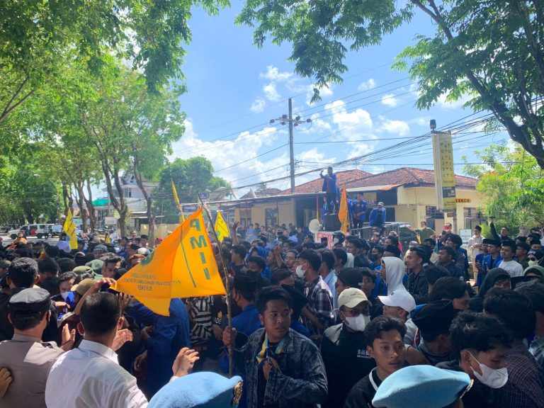 TROL, Sumenep – Unjuk Rasa aktivis PMII di depan Polres Sumenep pada, Senin (24/5) diwarnai ricuh saling dorong massa dengan aparat kepolisian. Ricuh mereda setelah Kapolres Sumenep AKBP Rahman Wijaya menemui pengunjuk rasa dan menandatangani tuntutan mereka.