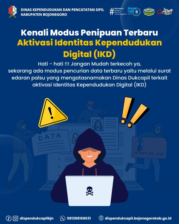 TROL, Bojonegoro – Dinas Kependudukan dan Pencatatan Sipil (Dukcapil) Kabupaten Bojonegoro mengimbau warga agar berhati-hati dengan modus penipuan aktivasi Identitas Kependudukan Digital (IKD). Pelayanan Dukcapil ini gratis dan hanya melalui aplikasi resmi atau tempat layanan administrasi kependudukan (adminduk) kecamatan, Mal Pelayanan Publik (MPP), dan Dinas Dukcapil.