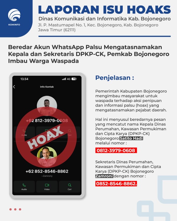 Kepala Dinas Komunikasi dan Informatika Kabupaten Bojonegoro Heri Widodo memastikan nomor WhatsApp tersebut bukanlah milik Kepala Dinas dan Sekretaris Dinas Perumahan, Kawasan Permukiman dan Cipta Karya (DPKP-CK) Bojonegoro.