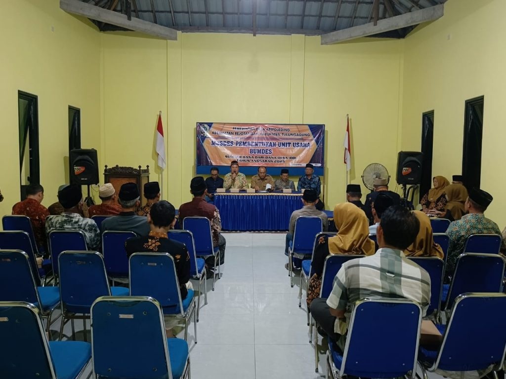 TROL, Tulungagung – Pemerintah Desa Ariyojeding Kecamatan Rejotangan menggelar Musyawarah Desa (Musdes) pada Senin (25/8) dengan agenda utama pembahasan dan pembentukan Unit Ketahanan Pangan. Kegiatan ini dihadiri oleh Camat Rejotangan Didi Jarot Widodo Nursamsu, Pendamping Desa, Kasi PP, Kepala Desa beserta perangkatnya, Ketua dan anggota BPD, Ketua dan anggota LPM, Pengurus serta Pengawas BUMDes, Ketua RW, serta tokoh agama dan tokoh masyarakat.