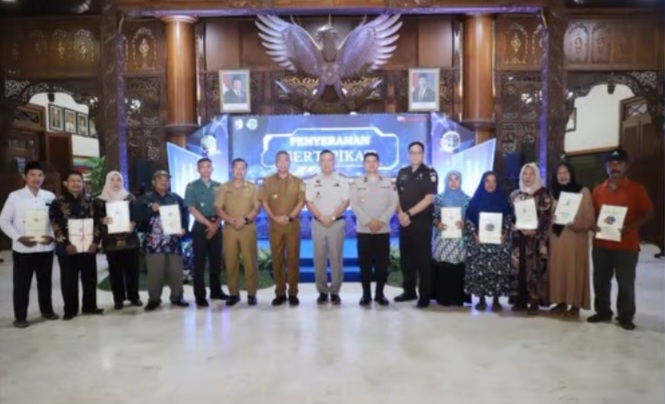 TROL, Tulungagung – Bertempat di Pendopo Kongas Arum Kusumaning Bongso, Senin (24/11) Bupati Tulungagung, Gatut Sunu Wibowo menyerahkan ribuan sertipikat tanah kepada warga melalui program Pendaftaran Tanah Sistematis Lengkap (PTSL) Tahun 2025 serta Sertifikat Hak Pakai Pemerintah Kabupaten Tulungagung.