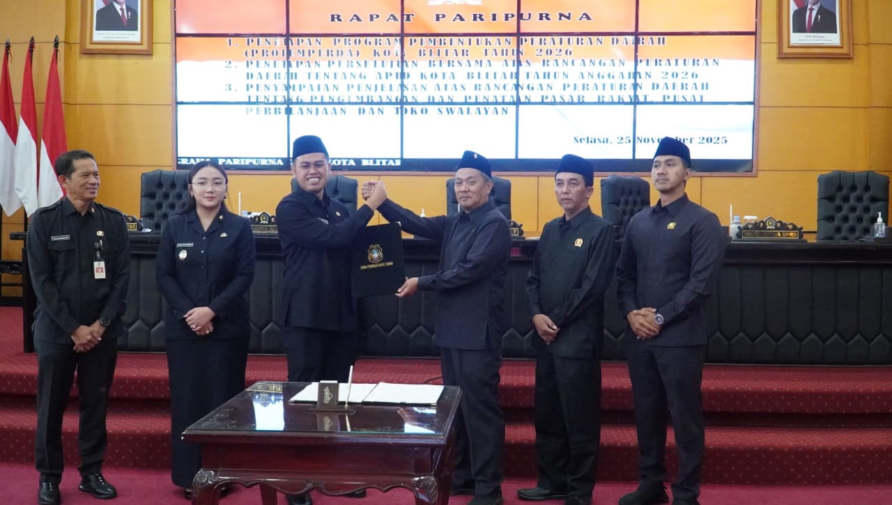TROL, Kota Blitar – Pemerintah Kota Blitar bersama DPRD Kota Blitar menetapkan tiga agenda strategis dalam Rapat Paripurna yang digelar pada Selasa (25/11). Tiga agenda tersebut meliputi Program Pembentukan Peraturan Daerah (Propemperda) 2026, persetujuan bersama Raperda APBD 2025, serta penyampaian penjelasan Raperda Penataan Pasar Rakyat, Pusat Perbelanjaan, dan Toko Swalayan.