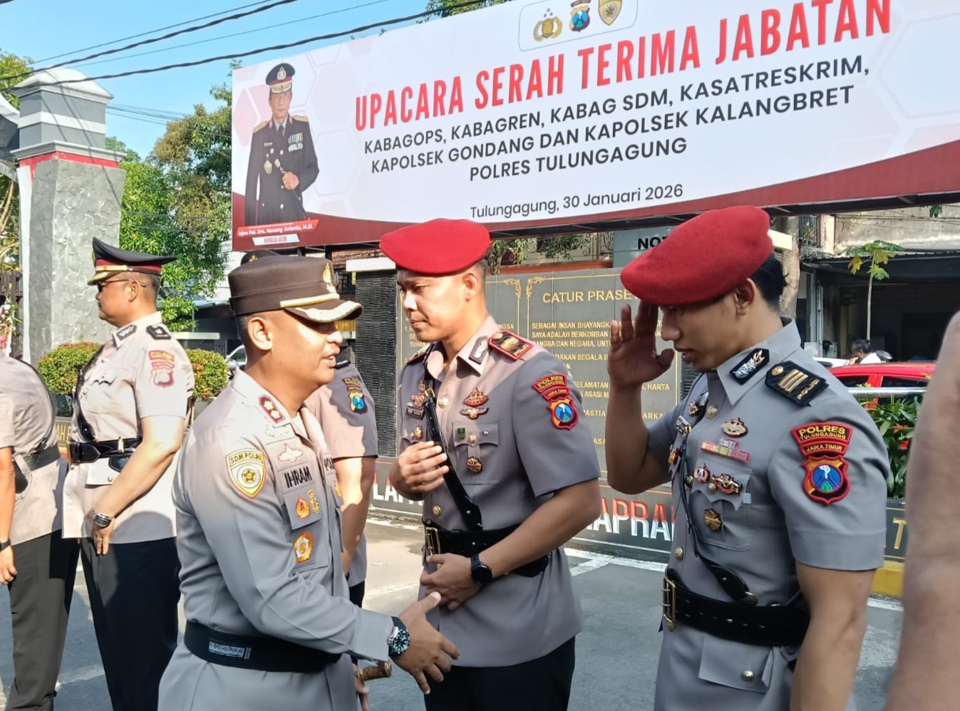 Upacara serah terima jabatan (Sertijab) dipimpin langsung oleh Kapolres Tulungagung, AKBP Dr. Ihram Kustarto, SH, SIK, MSi, MH, dan dilaksanakan di halaman Mapolres Tulungagung, Jumat (30/1) pagi.