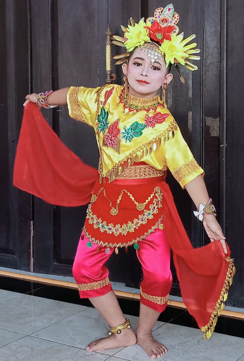 Aurel, diusianya yang baru masuk sekolah dasar tahun ini bersama teman lainya belajar menari di sanggar RARAsati di desa Bono.