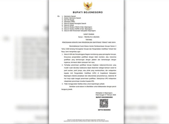 Bupati Bojonegoro, Setyo Wahono, secara resmi menerbitkan Surat Edaran (SE) Nomor: 700/381/412.100/2026 tentang Pencegahan Korupsi dan Pengendalian Gratifikasi Terkait Hari Raya. Kebijakan ini merupakan tindak lanjut atas Surat Edaran Komisi Pemberantasan Korupsi (KPK) RI Nomor 2 Tahun 2026 mengenai pencegahan dan pengendalian gratifikasi dalam rangka perayaan hari raya.