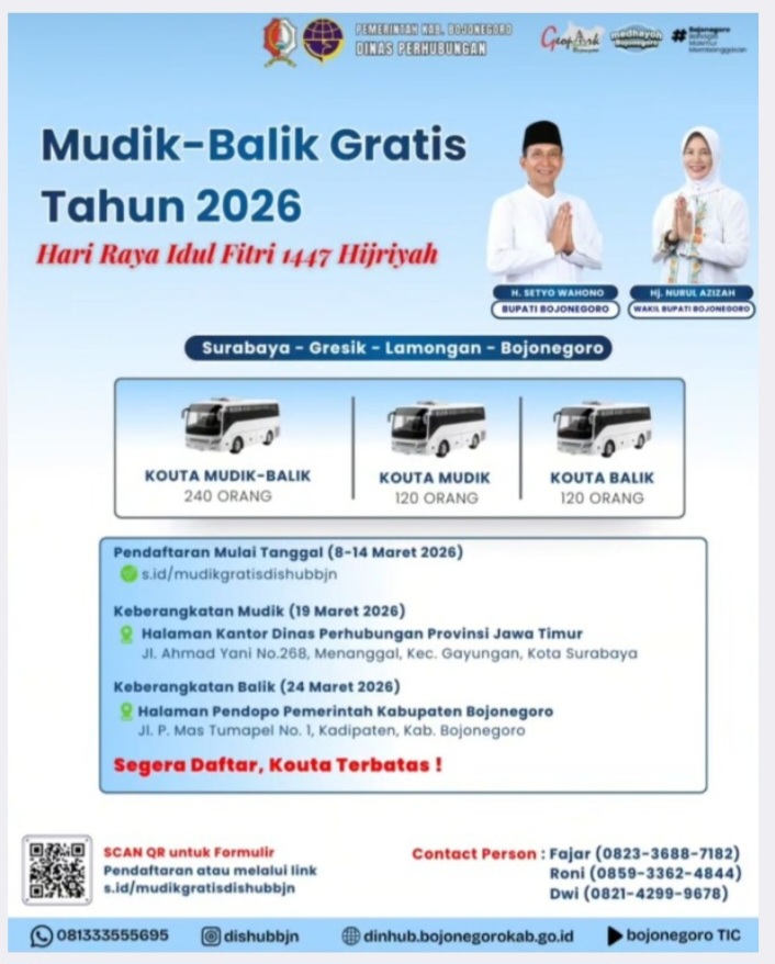 TROL, Bojonegoro – Pemerintah Kabupaten Bojonegoro melalui Dinas Perhubungan kembali membuka program Mudik–Balik Gratis Tahun 2026 dalam rangka menyambut Hari Raya Idul Fitri 1447 Hijriah. Program ini disiapkan untuk membantu masyarakat pulang ke kampung halaman dengan transportasi yang aman, nyaman, dan tanpa dipungut biaya.