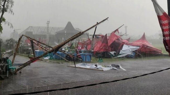 Selain merusak permukiman, angin kencang juga merobohkan puluhan tenda yang digunakan dalam Kejurprov Woodball di Desa Pojok, sehingga mengganggu jalannya kegiatan olahraga tersebut.