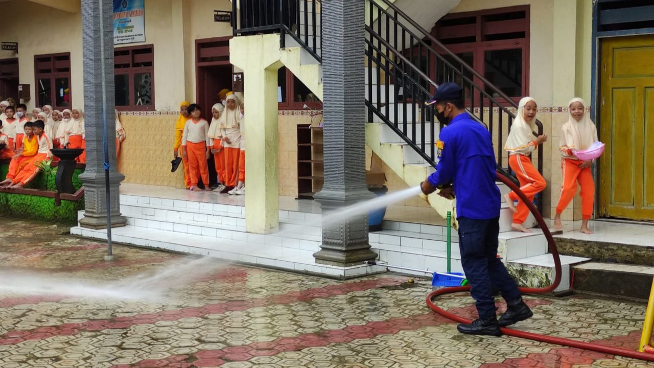 foto ;Damkar Trenggalek bersihkan sisa lumpur banjir di halaman MI Muhammadiyah Watulimo/Foto: Damkar Trenggalek